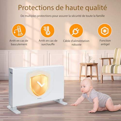 ✅【Protections de sécurité multiples】Le radiateur est doté d’une protection contre la surchauffe, d’une protection contre les basculements et d’une protection contre le gel. Si le convecteur bascule accidentellement ou devient trop chaud, il s’éteindra automatiquement. De plus, la fonction antigel maintient la température à un minimum de 5℃ pour éviter que l’eau ne gèle dans ses canalisations. Il vous fournira efficacement un environnement sécurisé et confortable.
