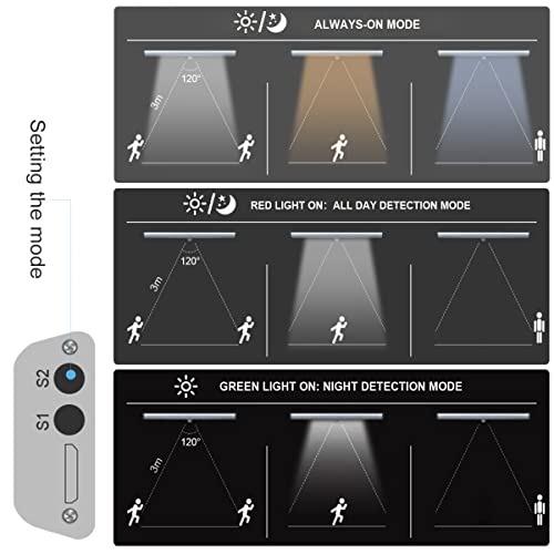 💡4 Modes de fonctionnement : (1) mode toujours actif ; (2) mode capteur toute la journée : La Lampe de placard s’allume lorsqu’un mouvement est détecté ; (3) Mode détecteur de nuit : la Lampe de placard s’allume dans l’obscurité lorsqu’un mouvement est détecté ; (4) Mode fermeture