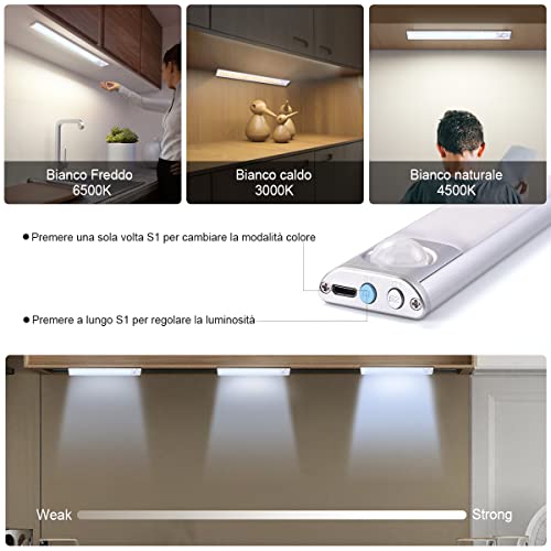 AiQInu Lampe de Placard, Reglette Led Cuisine Rechargeable USB, 30 cm Lampe Detecteur de Mouvement Interieur Sans Fil avec Bande Magnétique Autocollante pour Cuisine, Placard, Escaliers et Couloirs