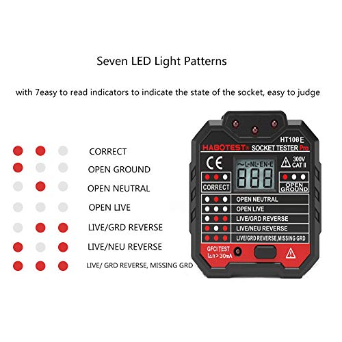 Testeur de prise avancé pour détecter rapidement si la connexion filaire de la prise est correcte ou non. Facile à utiliser: Détectez si le fil neutre, sous tension et à la terre est correctement connecté et pour indiquer quel fil manque avec des motifs de lumière claire.