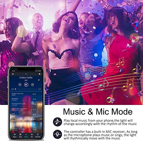 🌟【Mode Musique Dynamique & Fonction de Minuterie】 Grace au micro intégré à haute sensibilité, la couleur de la bandeau led Bluetooth peut changer suivre le rythme ou la mélodie, selon les différentes musique et le son ambiant, rendant votre environnement plein de vitalité et la fête plus excitante. La fonction de synchronisation vous permet de régler intelligemment l’heure d’arrêt sans gaspiller d’électricité.