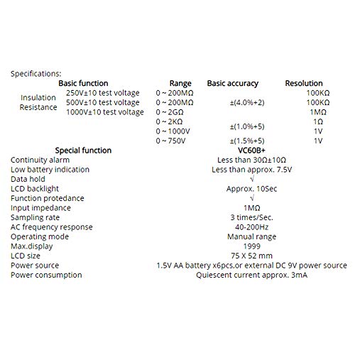 L’ensemble de l’instrument est élégant et de qualité supérieure en apparence et de haute stabilité en performance, il peut être utilisé à deux mains grâce à une bandoulière. Il est le plus adapté aux besoins de contrôle de résistance d’isolation, tels que les équipements électriques, câbles, électriques et mécaniques, les équipements de télécommunication et les installations électriques.