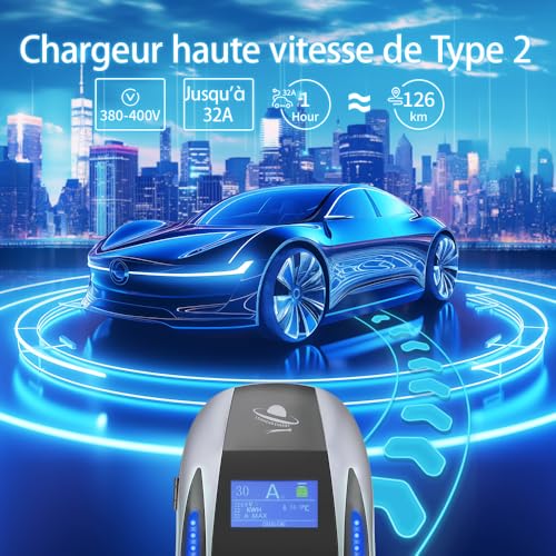 Borne de Recharge Vehicule Electrique, 22kW Chargeur Type2 avec 5 Mètres Câble, 32A, IP65, Chargeur Voiture Electrique Triphasé, Contrôle APP, Carte RFID, Bluetooth, WiFi