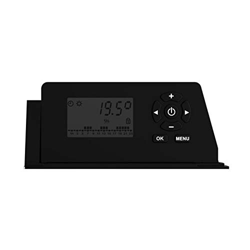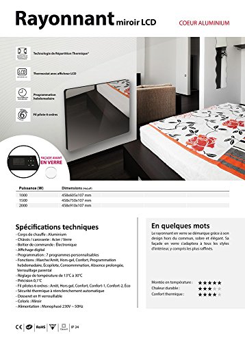 Panneau rayonnant électrique format horizontal et plat cœur de chauffe : panneaux rayonnants en aluminium châssis / carrosserie : acier laqué / verre de sécurité́ thermostat électronique affichage digital fonctions : arrêt, Hors-gel, Eco, confort, programmation hebdomadaire, consommation, écopilote®, écocitoyen, activité́, absence prolongée, verrouillage parental programmation : 7 programmes personnalisables mise à l’heure automatique réglage de la température de 13°c à 30°c précision de la régulation à 0,1°C fil pilotes 6 ordres : arrêt, hors gel, confort, confort-1, confort-2, Eco sécurité́ thermique à réarmement automatique et sécurité́ anti-basculement fixation murale : dosseret en h verrouillage – coloris : Miroir alimentation : monophasé 230V~ 50Hz