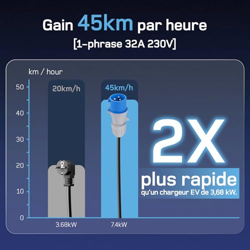 【 2 fois plus rapide que l’original 】 Avec la prise CEE 32A, vous obtenez une puissance de charge de 7,4 kW par heure (230 V x 32 A). 2 fois plus rapide que les prises Schuko domestiques normales. Le courant commutable 6/10/16/20/24/32A pour répondre à tous vos besoins.