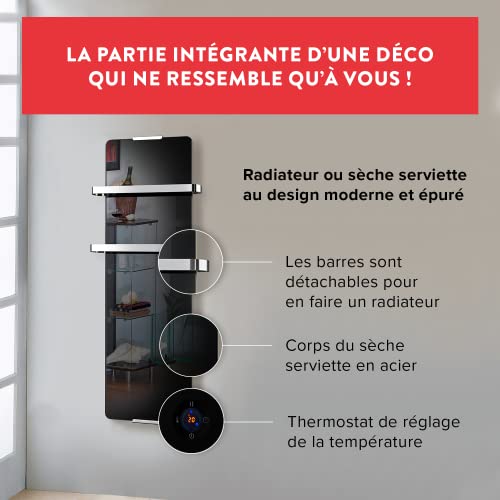 IDÉAL POUR LA SALLE DE BAIN : Spécialement conçu pour accueillir les serviettes, ce sèche-serviettes noir IP24 peut chauffer les petites pièces jusqu’à 15 m². Ses barres inox peuvent être retirées pour l’utiliser seulement comme radiateur.