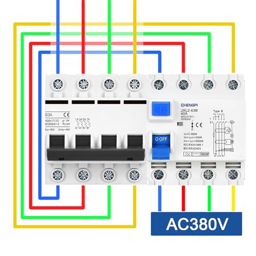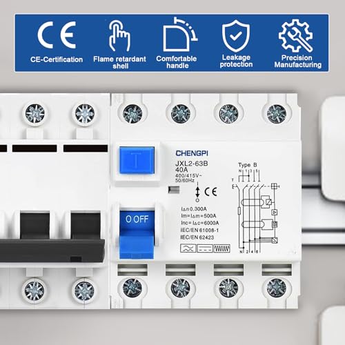 【PARAMÈTRES】: Type B 4P 40A 300mA, pouvoir de coupure jusqu’à 6 KA. Caractéristiques de connexion : AC 415V/50Hz.