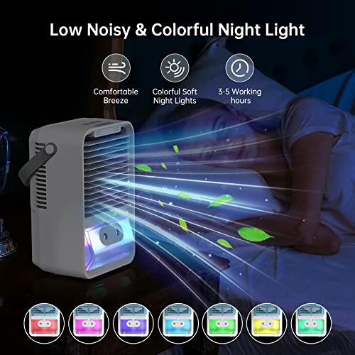 ❄️7 lumières LED colorées et 3 modes de luminosité avec réglage automatique : le mini rafraîchisseur d’air portable dispose de lumières LED douces colorées intégrées, 7 lumières douces différentes avec des couleurs qui changent automatiquement en séquence, ce qui crée non seulement une atmosphère romantique, mais aide également à mieux dormir. La luminosité des lumières peut être réglée et divisée en trois niveaux : faible/moyen/élevé.