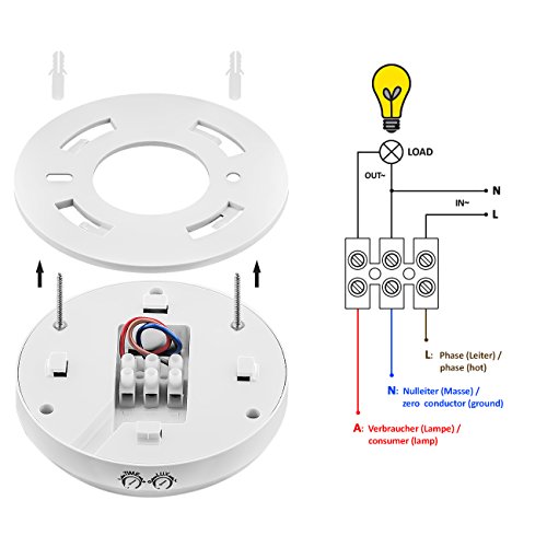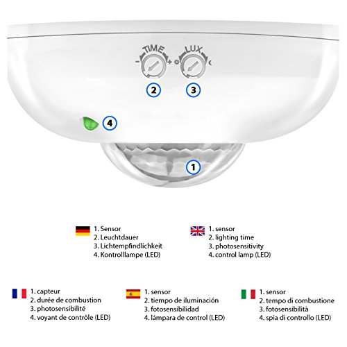 360° Champ d’action // Détection de Mouvement // d’Une portée de 6m // Niveau de Protection IP20 // Durée d’éclairage réglable (10sek. ~ 7min.) // Conçu pour un Montage en saillie // Optimal pour le Montage au Plafond