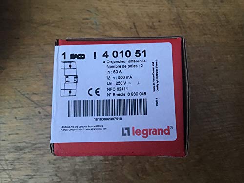 Disjoncteur de branchement bipolaire de marque Legrand 401051 Utilisé en tête d’installation d’abonné basse tension, il assure la protection contre les surcharges et les courtscircuits. Sensibilité du différentiel 500 mA Nombre de pôles 2 Plage de calibre 60 A.
