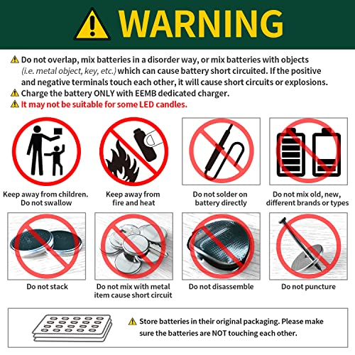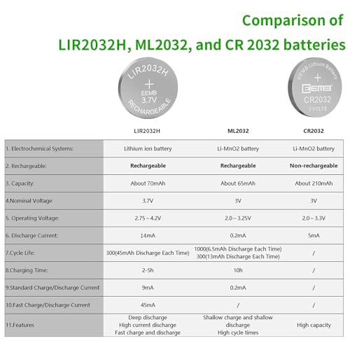 INFORMATIONS DE BASE—Tension : 3,7 V ; Capacité : 70 mAh ; Poids : environ 2,6 g ; Diamètre : 20 mm, Hauteur : 3,2 mm. Veuillez charger la batterie avec le chargeur dédié EEMB. Emballage inclus : Batterie LIR2032H X 4. Remarque : L’emballage du produit peut être différent dans chaque lot.