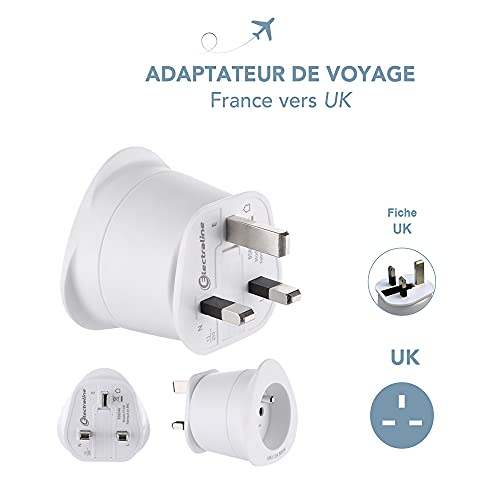 Adaptateur de voyage de haute qualité en matériaux, design et sécurité. Avec protection par fusible 13A. Adaptateur avec prise de terre, pour connecter fiches de type français et européen à prises de type anglais, Type G (Grande-Bretagne)