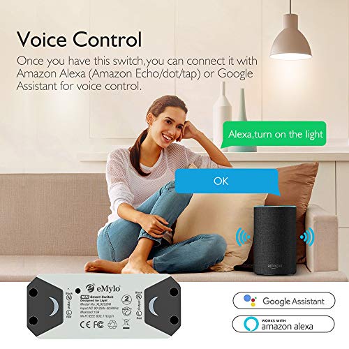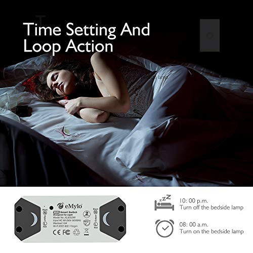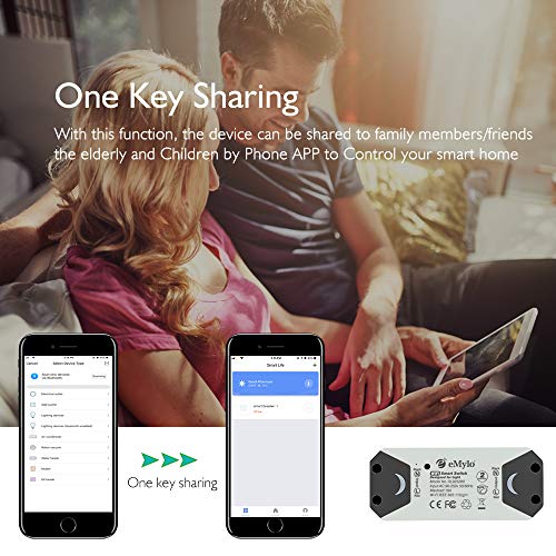 ♥ Smart WiFi Switch — Le commutateur intelligent eMylo permet aux utilisateurs de contrôler à distance tous les appareils connectés via l’application mobile «Smart Life». Parfait pour lampe AC à tension large AC 90-250V, ventilateur de plafond, lampadaire, arbre de Noël, éclairage de paysage extérieur et autres appareils ne dépassant pas 10Amp.
