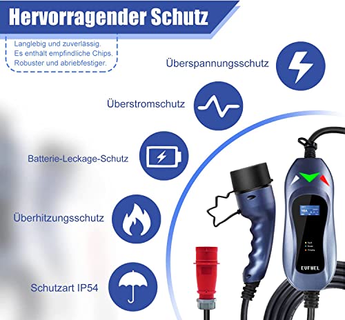 EVFUEL EV Chargeur Voiture Electrique Type 2 Triphasé CEE Borne de Recharge Véhicule électrique 11KW 16A Portable Chargeur EV Voiture électrique Câble 5 Mètres (16.4ft) 380V