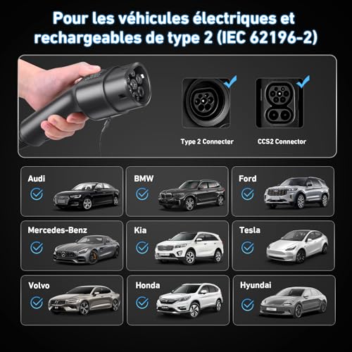 [Large Compatibilité] Compatible avec tous les véhicules électriques et hybrides européens de type 2 (IEC 62196). Y compris 3008/508/308 PHEV, C5X, DS7, GLA, Q3, X3, ID.3, ID.4, ID.5, e-Golf, e-Up, Model Y, Model 3, Spring, Kona, Ioniq 5 , e-tron, i3, i4, etc.