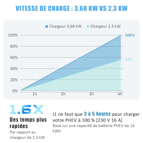 【Charge rapide en 3-5 heures】 : Avec une puissance de charge impressionnante de 3,68 kW, notre chargeur voiture electrique recharge votre véhicule 1,6 fois plus vite que les câble recharge type 2 traditionnels. Grâce à 230V x 16A, vous pouvez recharger votre PHEV de 0 % à 100 % en seulement 3 à 5 heures – parfait pour vos besoins quotidiens.
