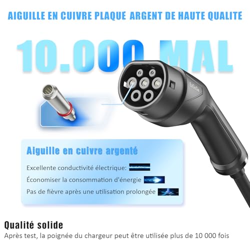 【Large compatibilité】 : Que vous ayez une Tesla, une Volkswagen ou une Peugeot, notre cable voiture electrique est compatible avec la plupart des PHEV/VE équipés de prises de type 2. Une solution fiable pour votre voiture.