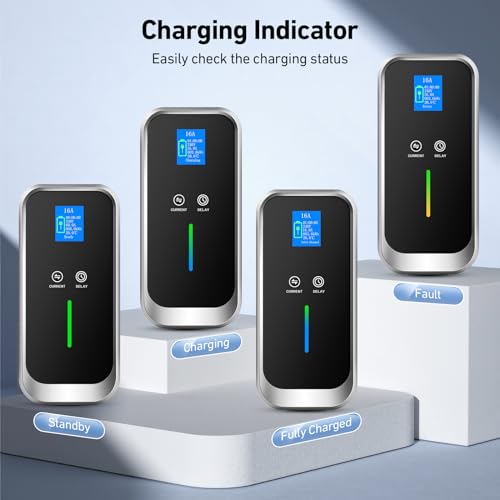 【Écran Numérique 】Ce EV chargeur type 2 est équipé d’un écran OLED. Comparé à l’écran LCD des autres chargeurs, écran OLED grand écran vous permet de surveiller clairement l’état de charge du chargeur, le réglage du courant, le réglage de l’heure, la température, le réglage de l’heure et les rapports d’erreurs, Vous pouvez contrôler les données de charge en temps réel un coup d’œil.