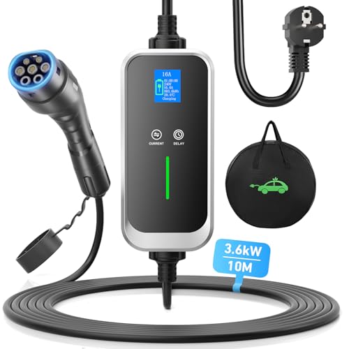 FNRIDS Chargeur Voiture Electrique 10M, 16A-6A Courant Commutable, 3.6kW EV Chargeur Type 2 avec écran, 0-12H Temporisé, IEC 62196, Cable Domestique Recharge Voiture Ãlectrique Type 2 avec Sac (10M)