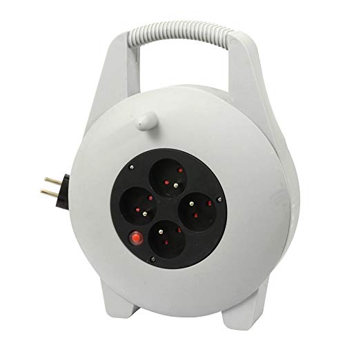 Enrouleur électrique de longueur 10m, compact, avec 4 prises 16A+T et un disjoncteur thermique. Câble de section 1mm²