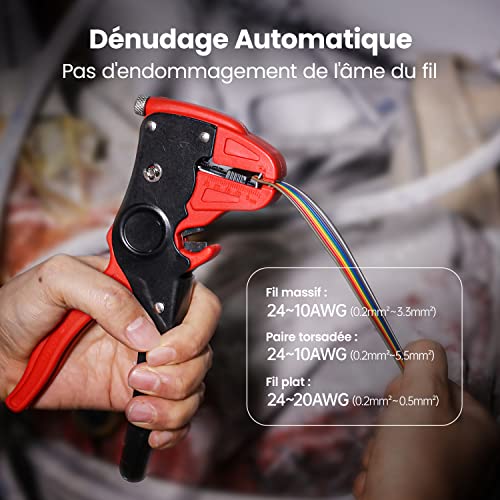 Dénudage et Coupe 2 en 1: Dénude avec précision les fils solides et toronnés de 10 à 24 AWG (0,2 mm² – 5,5 mm²). Adapté à dénuder les fils de haut-parleur et les câbles plats. Il coupe également les fils rapidement