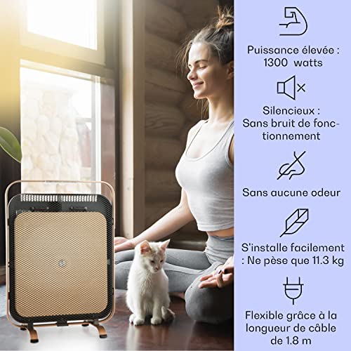 INTERRUPTEUR AU DOS DE L’APPAREIL : Chauffage electrique mural à 1300 W grâce à sa technologie infrarouge. Maintien stable grâce à ses pieds larges.