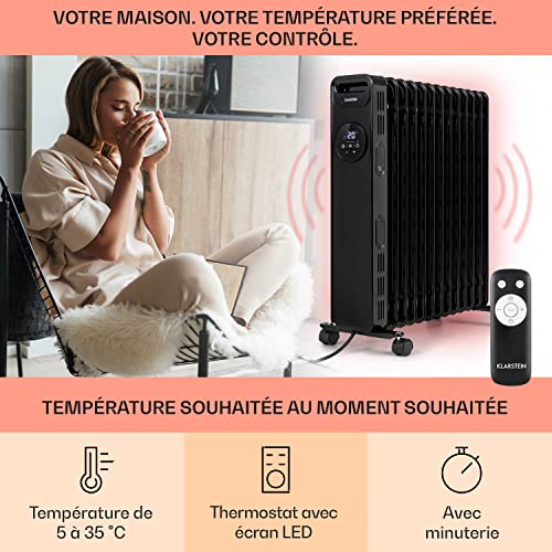 CHALEUR ET ÉLÉGANCE DANS VOTRE MAISON : Nos radiateurs à huile apportent une chaleur douillette pendant l’hiver. Ce convecteur basse énergie Klarstein 2500W assure une distribution uniforme de l’air chauffé dans toute la pièce.