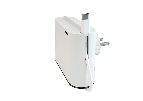 Adaptateur avec double prise latérale 2P 10 A 230 V 3680 W et charge USB A+C 3,0 A 5,0 V 15,0 W max. Comprend un support pour smartphone et une fente de gestion des câbles Format extra plat Essentiellement pour une utilisation dans des espaces restreints, comme il peut être derrière une table de chambre. Couleur : blanc/anthracite