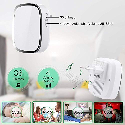【36 Mélodies et 4-Niveaux de Volume】36 Sonneries en qualité de CD sont à votre choix en appuyant sur le bouton du récepteur, avec 4 niveaux de volumes réglables 25dB-85dB.