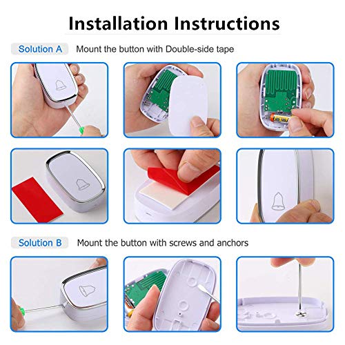 【Installation Facile】2 pas Brancher le récepteur portable à n’importe quel secteur, et coller l’émetteur sur le mur avec patch ou vis fourni. Le récepteur ne demande pas de batterie. Débrancher le récepteur pour que le carillon ne sonne plus.