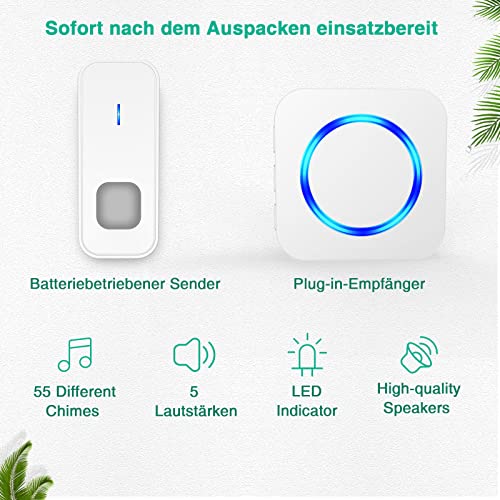 SURFOU Sonnette sans Fil Longue Portée 400M Exterieur Ãtanche Kit de Carillon Electronique avec Pile, 55 Mélodies au 5 Niveaux Volumes pour Maison, Indicateur LED Bleu, Blanc