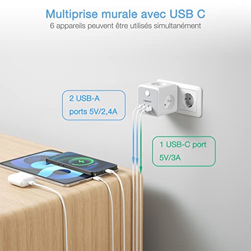 3 Prise française & 3 Ports USB: La multiprise murale TESSAN peut être raccordée à des prises françaises. Il suffit de le brancher sur une prise usb multiple et de l’étendre à 3 bloc usb prises polyvalentes françaises reliées à la terre et à 3 prises USB. Avec une puissance maximale de 2500 watts à 250 V, 10 A. 1 USB C et 2 USB A à un total de 5V, 3A et 15 watts, il détecte automatiquement vos appareils et fournit le courant le plus rapide possible