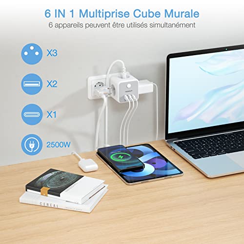 TESSAN 6 en 1 Chargeur USB Murale Prise, Multiple 3 Prises Française avec 1 USB C Secteur et 2 Type A, Type C avec Interrupteur 2500W, Adaptateur USB Multiprise Cube pour Domicile, Bureau, Gris