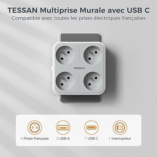 Prise Secteur USB C: TESSAN prise multiple avec 2 ports USB A et 1 port USB C, La sortie USB A est de 5 V, 2,4 A. La sortie USB C est de 5 V, 3 A. Prise USB C convient pour téléphone, tablette, appareil photo, etc