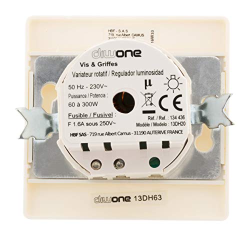 Ce variateur rotatif a une puissance mini de 60W et maxi de 300W. Il suffit simplement de faire tourner le bouton pour allumer et faire varier la lumière à votre guise. Pour éteindre, il faut tourner le bouton dans le sens inverse. 50Hz-230V. Facile à installer et livré avec vis et griffes. Couleur: blanc. Certifié NF et CE.