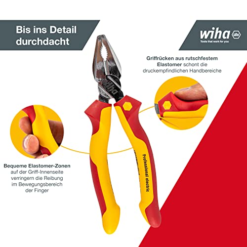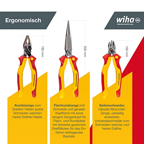 Safety is the top priority when users are working on live parts. The Professional electric plier set supplies the perfect basic equipment for electricians and other electricity specialists. Wiha needle nose pliers with an extra-long plier head are eminently suitable for inserting low-lying components. Wiha combination pliers provide a safe, non-slip grip in all work situations. Also contained in the set, the diagonal cutters impress as a universal cutter to slice soft and hard wires. Its Special DynamicJoint design also reduces effort required for cutting. The ergonomically shaped multi-component handles with anti-slip protection also ensure users can work safely and comfortably. Thanks to their chrome-plated plier head, they are also protected against rust. These pliers undergo routine individual piece testing as per the international IEC 60900 standard, thus providing users with a tool to work safely on live parts up to 1,000 V AC. Standards. Manufactured acc. to IEC 60900. Design. All pliers made of high quality tool steel, hardened, polished and chrome-plated Multiicomponent handles with slip guard for safe and comfortable operation Individually tested for electrical safety in accordance with IEC 60900:2012 Weight 820 g. Content. VDE combination pliers, series Z 01 0 06, 180 mm – with Wiha DynamicJoint. VDE diagonal cutters, series Z 12 0 06, 160 mm – with Wiha DynamicJoint. Needle nose pliers series Z 05 0 06, 200 mm. Application. For work in the area of live parts up to 1,000 V AC.